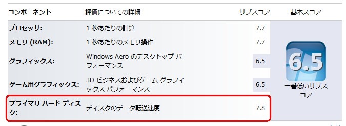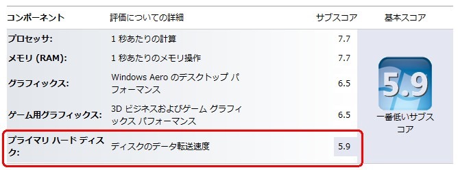 SSDに換装したら、一気にスコアが上がりました(5.9 -> 7.8)。換装したSSDもそれほど高いものではなく低価格(256Gで1万円強)のものの割りに、十分満足できるスコアです。これでしばらくはアップグレードせずに済みそうです。