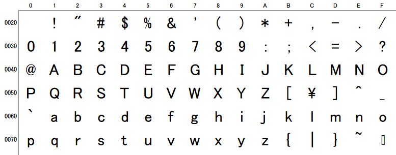 00~1F、7Fが制御文字、20~7Eが記号、英数字に割り当てられています。