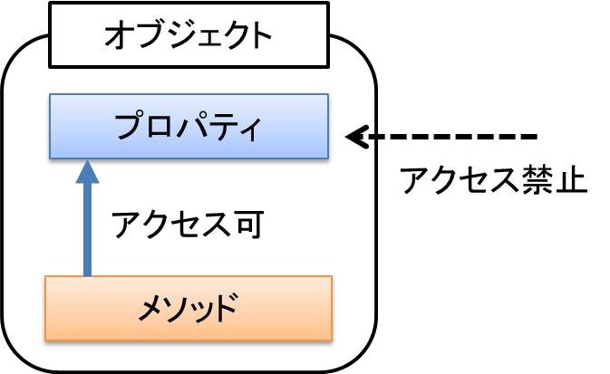 オブジェクトはプロパティとメソッドをメンバとして含有しています。オブジェクトは、オブジェクトの外部から内部のメンバに直接アクセスすることを禁止できます。つまり、オブジェクト内のメンバを外部から隠蔽することでそのメンバを保護できます。