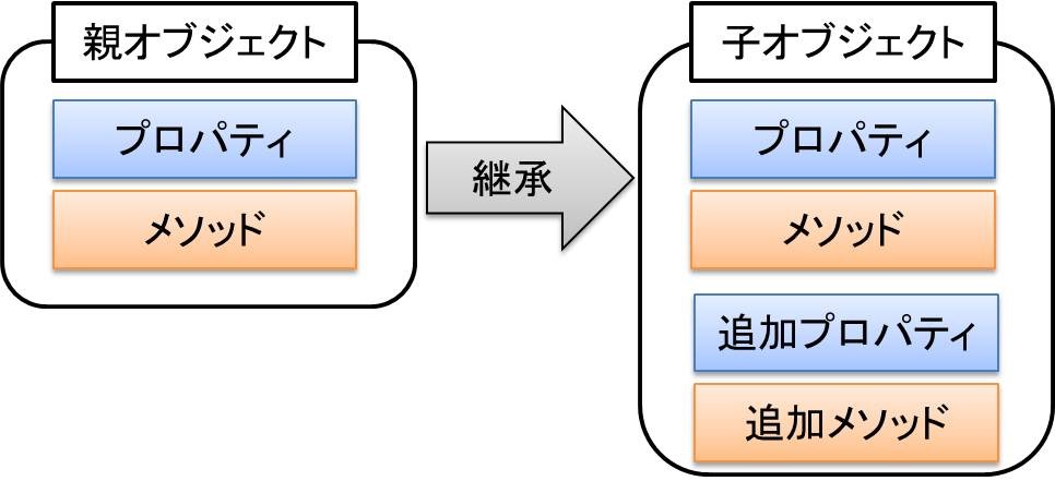 すでに定義されているオブジェクトからそのメンバをそのまま引き継いだ子オブジェクトを新たに作成できます。親オブジェクトのクラスを基底クラス(またはスーパークラス)といい、子オブジェクトのクラスを派生クラス(またはサブクラス)といいます。 継承という概念により、基底クラスのプロパティやメソッドをそのまま継承した派生クラスに新たなプロパティやメソッドを加えたり、再定義したりすることで機能を拡張することができます。