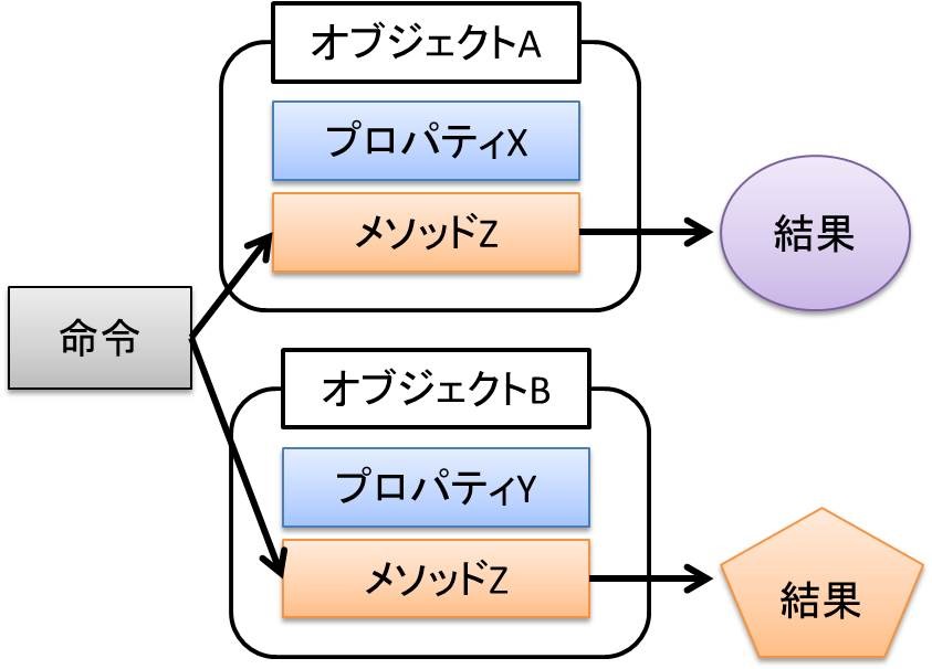 クラスが異なれば同じ名前を持ったプロパティやメソッドでも異なる機能を定義できます。これを多態性(または多様性)といいます。下記の図は、同じ名前「Z」のメソッドを実行してもオブジェクトが異なるため、得られる結果が異なることを示しています。