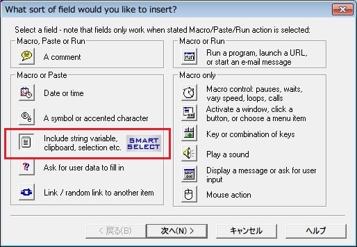 6. 左側の中程にある[Include string variable, clipboard, selection etc.]を選択し、[次へ]をクリックします。