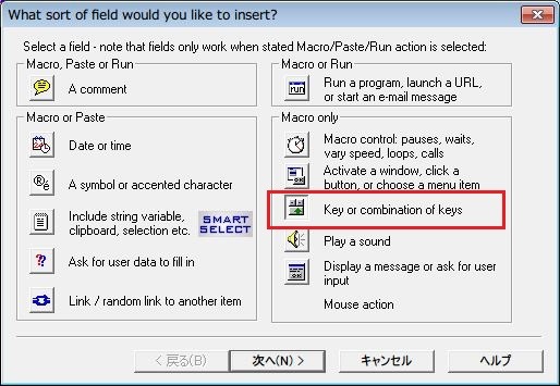 9. 右の中程にある[Key or combination of key]を選択し、[次へ]をクリックします。