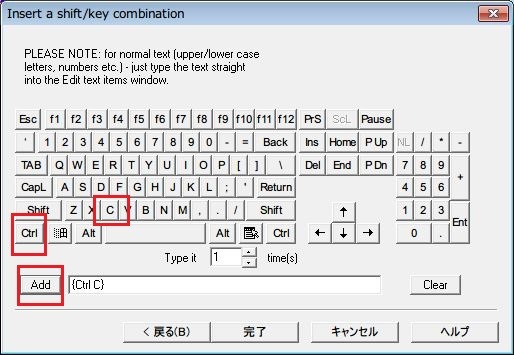 テキストボックスに「{Ctrl C}」と表示されるのを確認して、完了をクリックします。