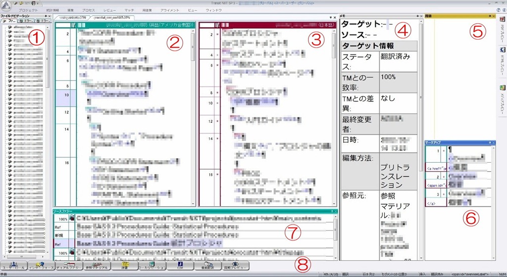- ターゲットウィンドウ:訳文を表示します。ここでエディットします。