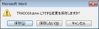 最近、Wordを終了する際、このダイアログが必ず表示されます。何か悪さをする訳ではないのですが、毎回しつこく現われるとちょっとイラッとします。変更などした覚えもないことですし、保存しようとしまいと何も変わりません。ちょっと手が空いたところで、問題を解決することにしました。以前のバージョンのTRADOSやWordでも発生したことがあるのですが、その時は次の方法で対処しました。