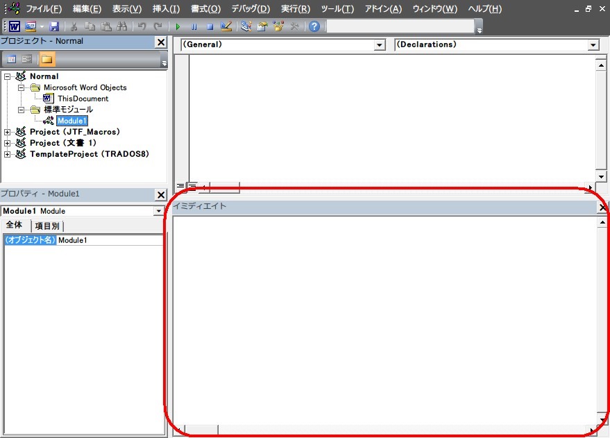 イミディエイトウィンドウが開きます(赤枠の中)。